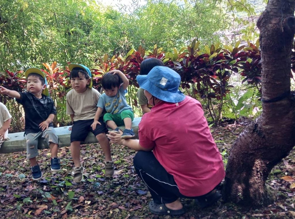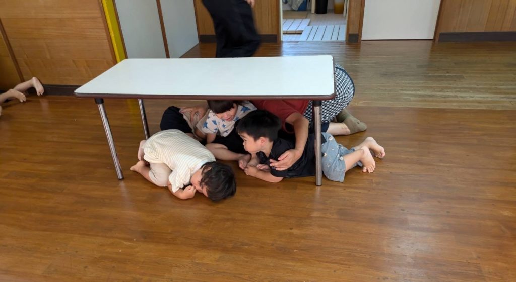 おひさまぐみ:地震の避難訓練で机の下に隠れて、小高い場所まで歩いて避難しました。