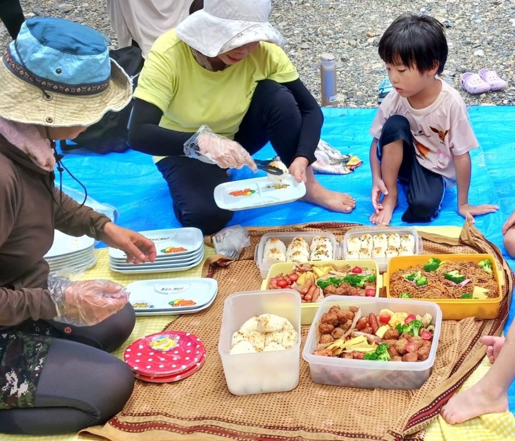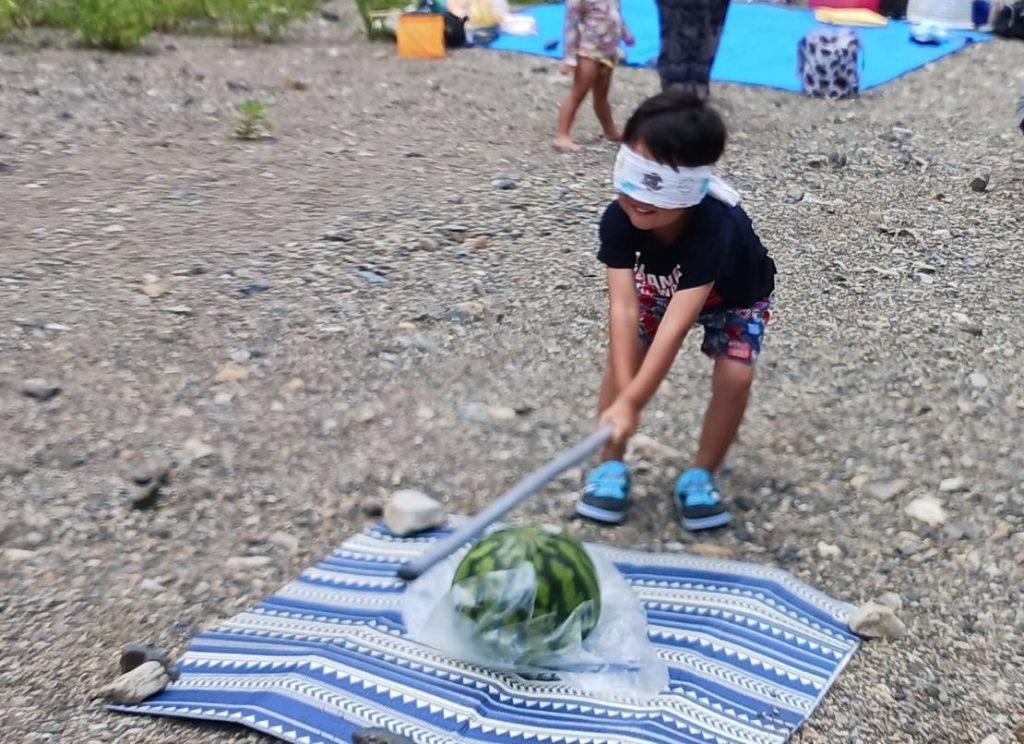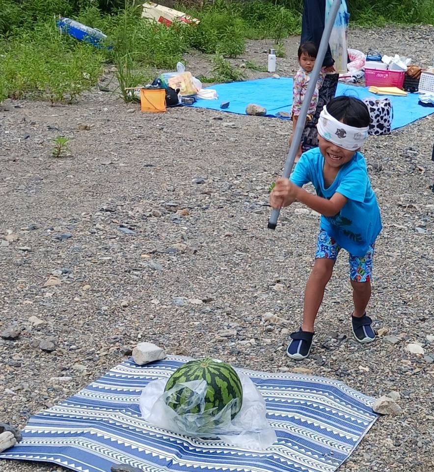 川で遊んだ後は美味しい手作りお弁当を食べて、スイカ割をしました。
