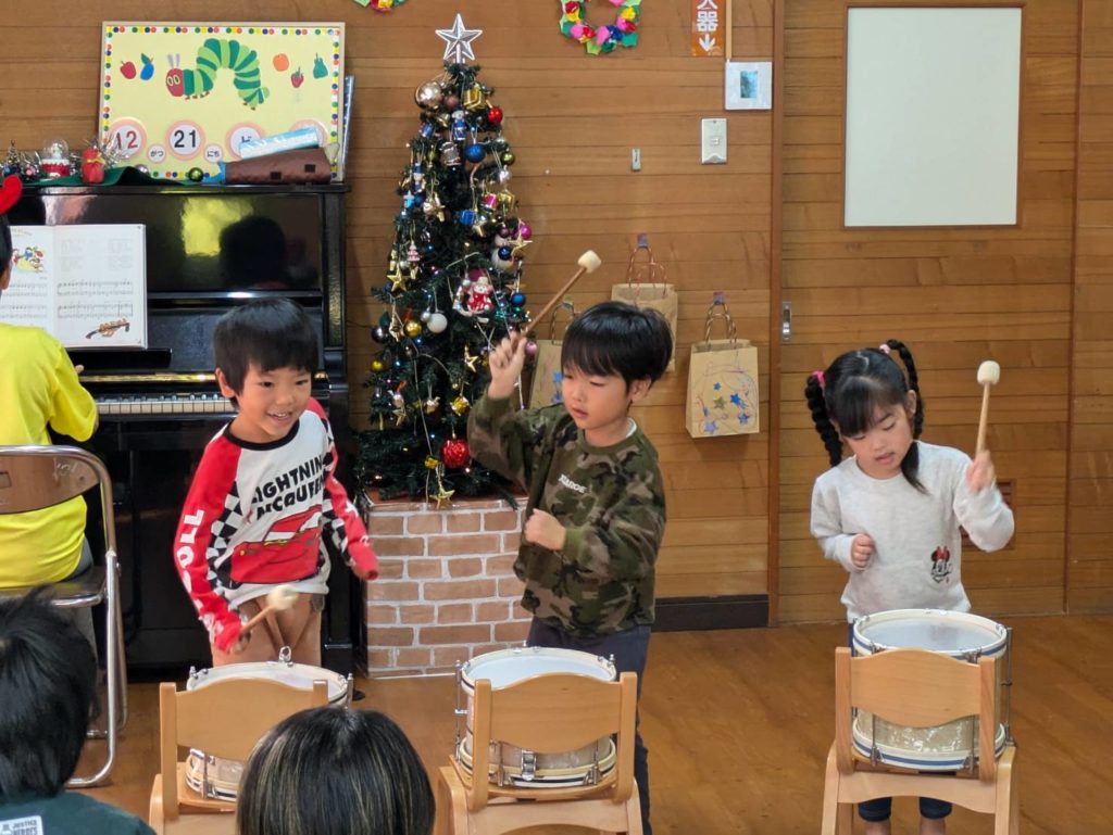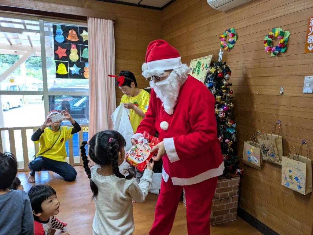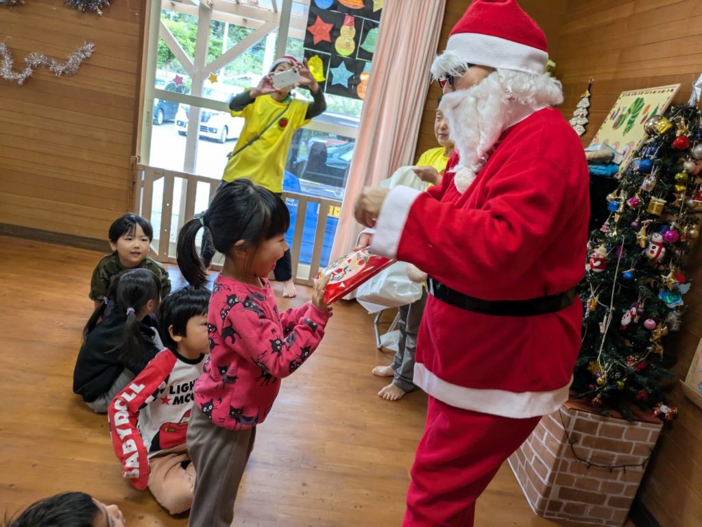 親子遊び・「あわてんぼうのサンタクロース」に合わせた楽器遊び・クリスマスの絵本の読み聞かせや手作りのペープサートを見た後に皆で軽食を食べて、サンタさんからプレゼントをもらいました。