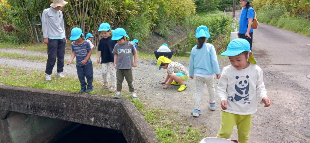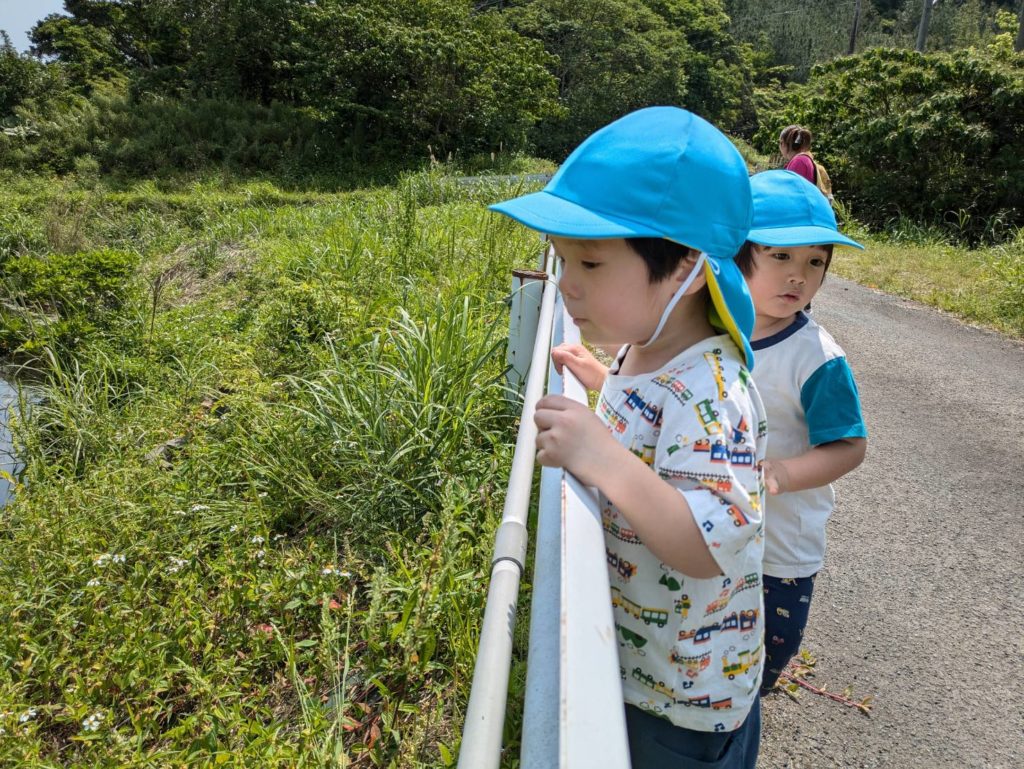 川が流れていて生き物を見つけて大喜びです。