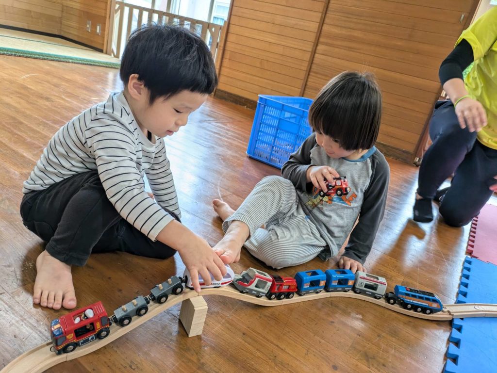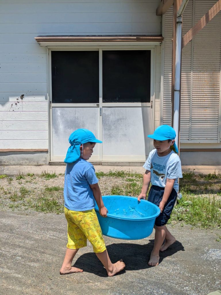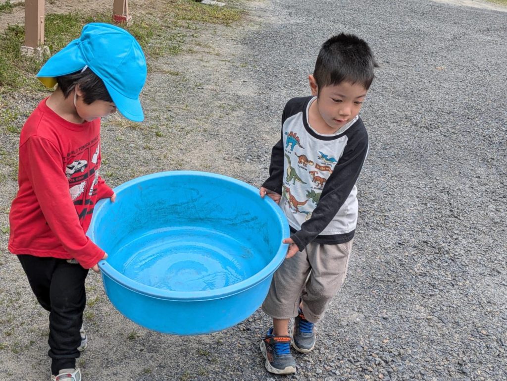 二人で力を合わせて水の入ったタライを水道から砂場まで運んでいます!